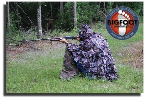 NEW BIGFOOT CAMO 3-D GHILLIE SUIT PONCHO BIGFOOT CAMO - THEY'RE OUT THERE - JUST CAN'T SEE 'EM TM This suit is for the serious hunter. Providing the ultimate in concealment suits like these are used by military personnel, paintballers, hunters, and outdoor photographers.Features: Extremely lightweight and comfortableEasily fits in to a backpackDesigned to be worn over t-shirts and jeansMore durable and stronger than burlapCovers head, torso, back upper arms, and upper legsCan be configured to be worn upright or as a military style crawling ghillieLightweight synthetic materialScentlessHand-washableNon-allergenicFire, water and mildew resistant